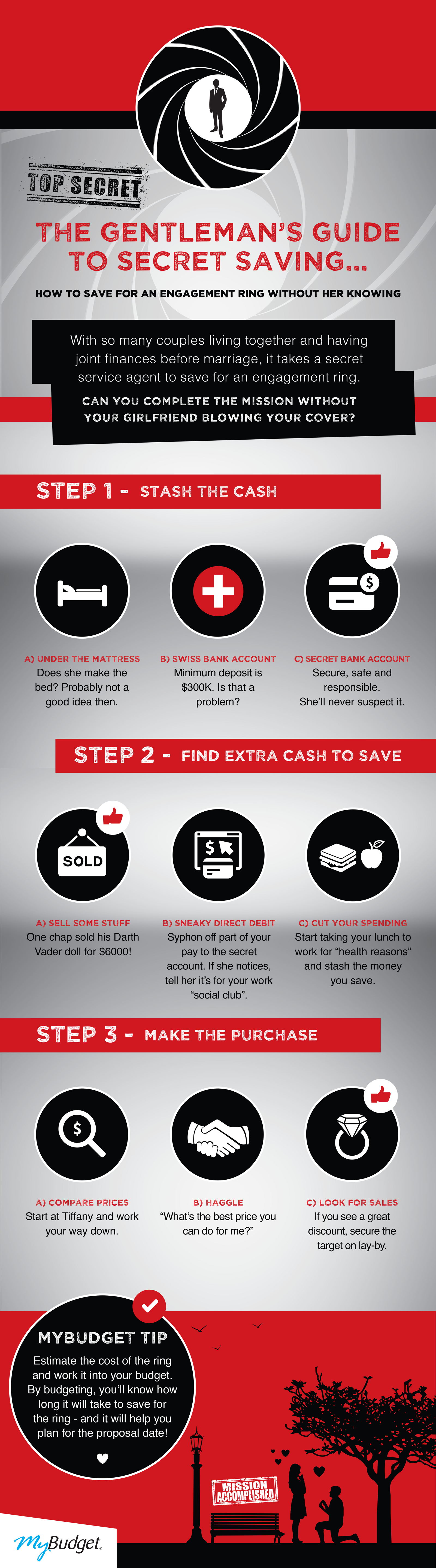 With so many couples living together and having joint finances before marriage, it takes a secret service agent to save for an engagement ring. Can you complete the mission without your girlfriend blowing your cover?