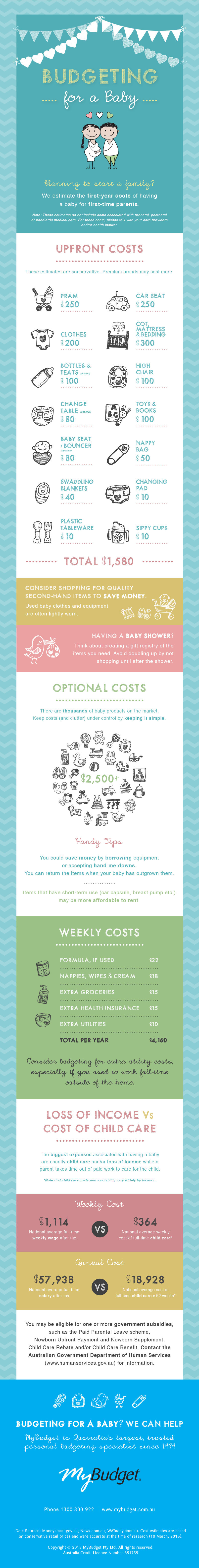 They say the only thing a baby needs is love and cuddles. And nappies. And perhaps a cot, pram, change table, wet wipes, clothes and toys. Lots of toys. Did we mention an approved car seat? Those cute, little, newborn bundles can sure be budget busters. To help families with financial planning, we are pleased to estimate the first-year costs of having a baby for first-time parents and we share our tips for keeping costs down. (Our estimates do not include costs associated with prenatal, postnatal or pediatric medical care. For those costs, please talk with your care providers and/or health insurer.)