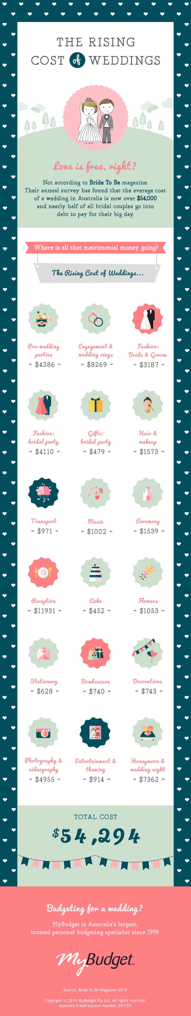 Love is free, right? Not according to Bride To Be magazine. Their annual survey has found that the average cost of a wedding in Australia is now over $54,000, and nearly half of all bridal couples go into debt to pay for their big day. Find out where all that matrimonial money is going and see how your wedding budget compares.